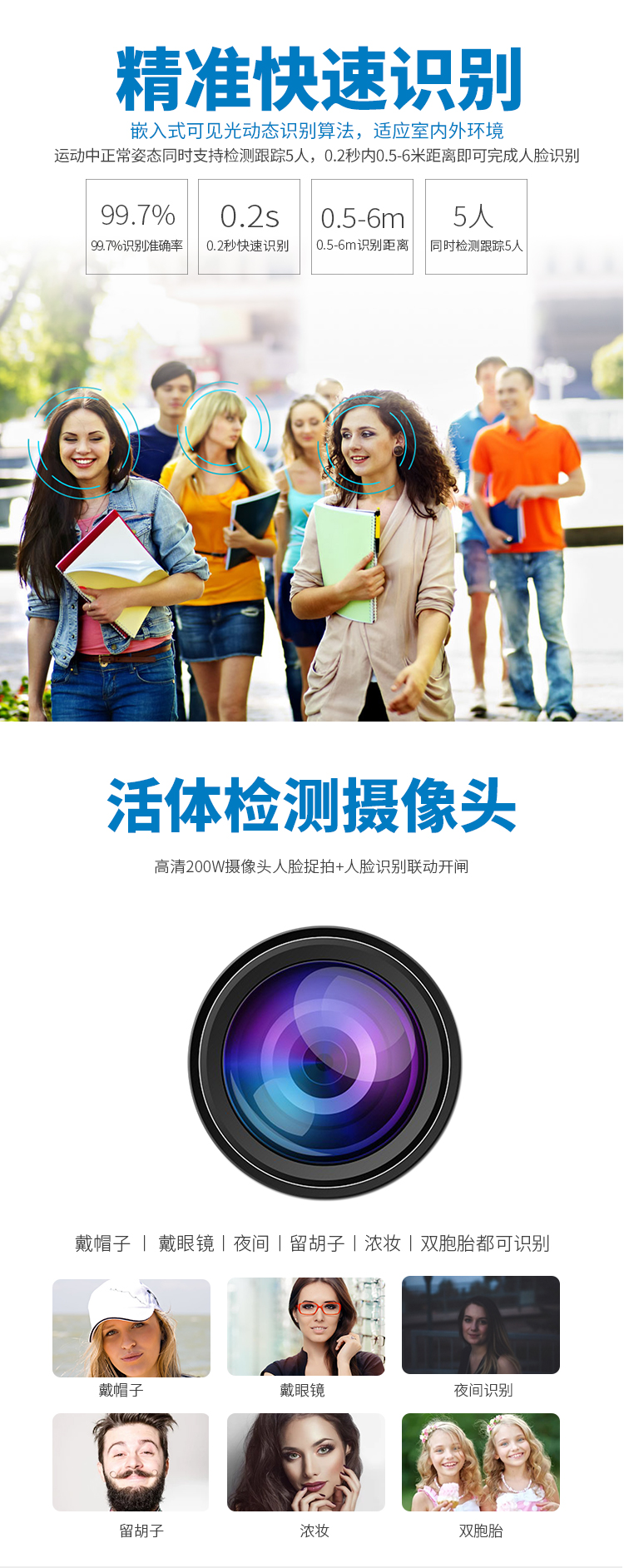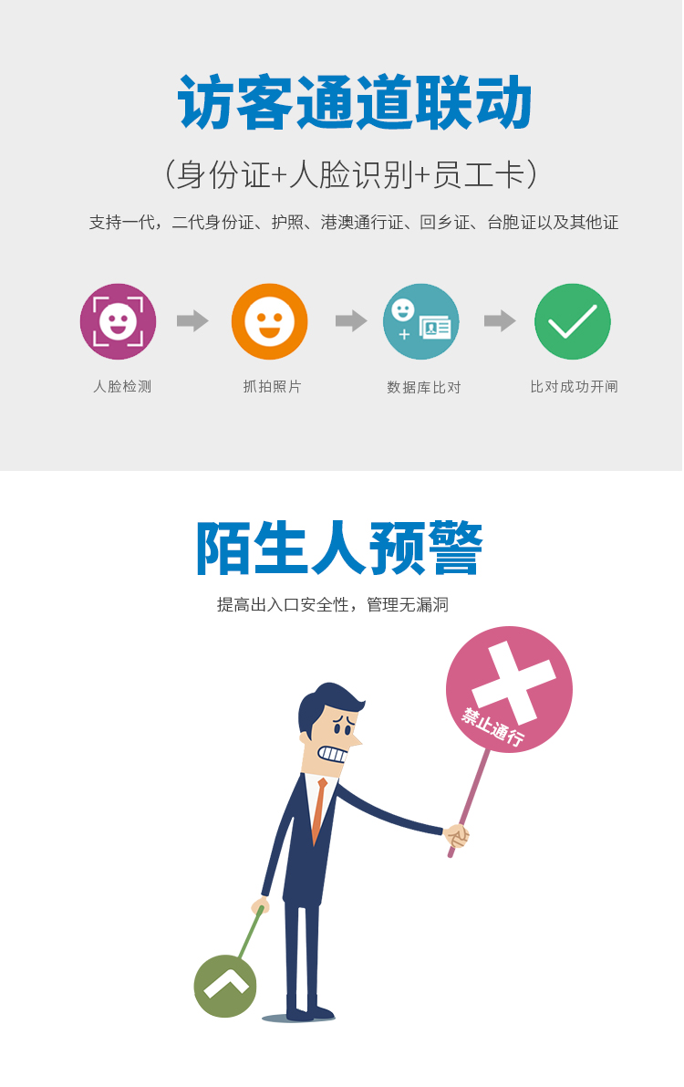 人(rén)臉識别開(kāi)閘,體(tǐ)驗流暢,活體(tǐ)(選配)。32位4核ARM高(gāo)性能(néng)處理(lǐ)器(qì),響應迅速、開(kāi)閘IO信号控制(z↕hì)、陌生(shēng)人(rén)示警功能(néng)、訪客預約刷臉通(tōng)行(xíng)